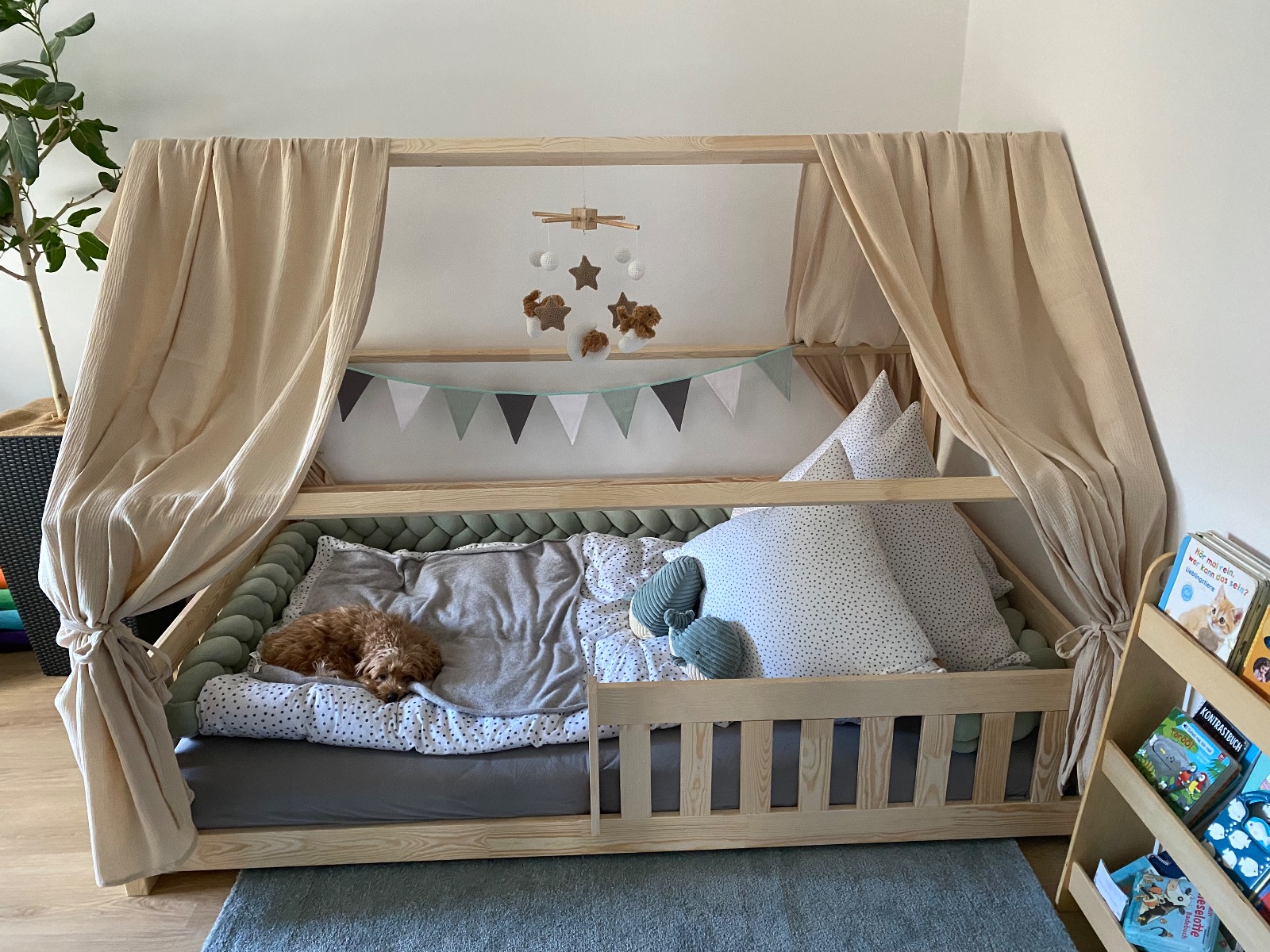 Klasická girlanda bude skvělou ozdobou postele ve tvaru domečku nebo stanu teepee.